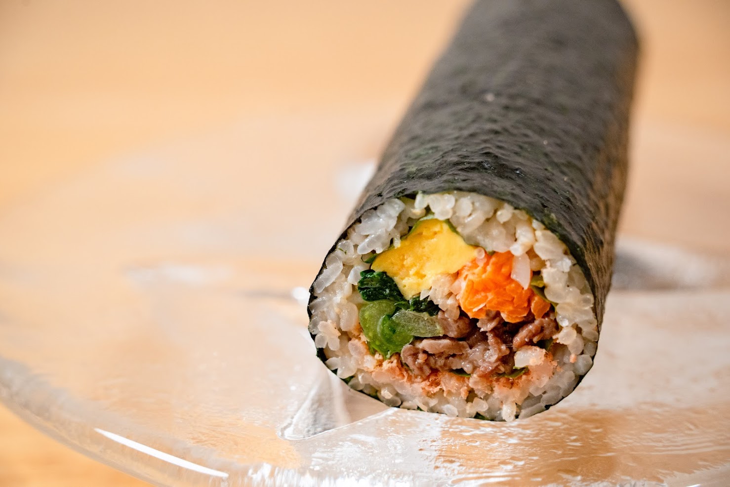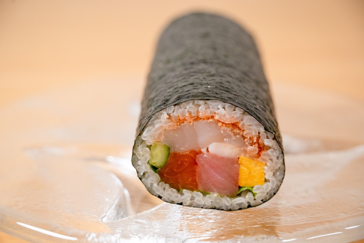 目利きの魚屋から仕入れた、マグロ、ホタテ、海老、イカ、サーモンを丁寧にさばき、きゅうり、卵焼き、舞鶴産天然真鯛で作った自家製「桜でんぶ」とともに巻き上げました。